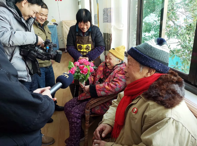 一进养老中心,记者随机采访了一对夫妻老宝贝,爷爷俏皮的送了一把鲜花给自己的老伴儿,