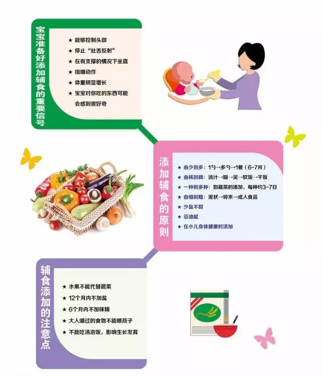 添加时间:4个月还是6个月 什么时候可以给宝宝添加辅食?是4个月时就可以开始,还是说要等到6个月?不同的孩子添加辅食的时间都是不一样的,所以要具体问题具体分析。 母乳是最适合宝宝吃的食物,但是在宝宝长到一定时候一定要给他添加辅食,因为4个月以后母乳中维生素B1、烟酸、维生素C和D以及铁等营养素不能满足宝宝的身体所需。 至于添加的时间,每个人都是不一样的,4—6个月只是大概的范围,从开始添加辅食到成功大约要1—2个月的时间。有时候你在4个月时给宝宝添加辅食,可是要到两个月以后宝宝才能够完全接受。 怎样判断孩子是否需要添加辅食?爸爸妈妈可以这样判断:如果母奶充足,可以晚一点给宝宝添加辅食,如果不充足,要给宝宝吃一些奶粉作补充,可以提早添加辅食。 添加首选:谷类还是蛋黄 宝宝快5个月了,我们打算给宝宝吃一些辅食,婆婆说可以给宝宝吃蛋黄。但是之前看到说最好先给宝宝添加谷类。还有,请问什么时候能给孩子添加肉类辅食呢? 最开始添加辅食的时候,米粉是一个很好的选择。最好不要太早添加蛋黄,添加时间太早会造成宝宝过敏。至于肉类的添加,通常在9个月的时候。 因为孩子的消化系统还不完善,所以刚开始添加的食物要柔软、易吞咽、易消化、不易引起过敏。肉类食物里面有着丰富的铁,可是就算是泥糊状,也还是需要咀嚼后才能咽下,消化起来也很困难。 添加味道:辅食需要加调味品吗 最好不要给宝宝再添加调味品,孩子的辅食跟成人的食物不一样,首先要考虑食品质量和营养需要。 大人觉得孩子会喜欢吃甜的,因此会买一些糖果、糕点给孩子吃。这种做法其实不太妥当,虽然糖可以提供热量,可是其它的营养物质非常少,吃太多反而会损害健康。 至于盐,尽量不要添加,因为12个月内的婴儿肾脏功能还不完善,盐过多的话会加重肾脏的负担,让孩子的口味变重,时间长了还会增加成年后患高血压的危险。其实,母乳、配方奶中盐的含量都已经足够了,不需要额外再添加。 添加判断:如何判断孩子是吃饱了还是拒绝辅食 读者:喂新食物时宝宝会用舌头把它顶出来,这是因为什么呢? 相关专家说明:喂新食物时,宝宝会用舌头把它顶出来,这是宝宝的一种本能行为。如果宝宝现在不想吃,爸爸妈妈不要强迫孩子接受,可以等待一段时间再尝试下。经过几次甚至十几次“试吃”后,宝宝会慢慢喜欢上这个味道的。 怎样判断孩子是吃饱了? 首先是通过时间,婴儿胃排空的时间大约是3小时,如果刚刚喂好奶一会儿就给把吃辅食的话,宝宝一点都吃不下。 另外,每顿饭的量最好也要差不多,一口口喂,看看宝宝的适应情况,如果孩子闭上嘴不吃了或用手推开碗,就代表着宝宝吃的量已经足够了。如果当时吃的量和这段时间吃的量相差无几,就不要再强迫了。 【小贴士】 中国疾病预防控制中心营养与食品安全所妇幼营养室副研究员曾经推荐过这样的一个食谱: 【6个月】 早餐:母乳或200毫升配方奶。 午餐:1~2勺米粉糊或稠粥,1~2勺蔬菜泥,1~2勺水果泥。 下午加餐:母乳或200毫升配方奶。 晚餐:母乳或200毫升配方奶,加上1-2勺米粉糊。 睡前:母乳或200毫升配方奶。 【7—9个月】 早餐:母乳或200毫升配方奶。 午餐:2~4勺米粉糊或稠粥或面条,2~4勺蔬菜泥,1~2勺鱼肉泥或肝泥(或者1/4~1个鸡蛋黄),半小勺油。下午加餐:母乳或200毫升配方奶,1~2勺水果泥。 晚餐:母乳或200毫升配方奶,给宝宝吃一些面包片或饼干。 睡前:母乳或100~200毫升配方奶。 【10—12个月】 早餐:母乳或250毫升配方奶,加2~3块面包片或饼干。 午餐:2~4勺软米饭或面条,2~4勺蔬菜碎块,1~2勺鱼、肉末或动物肝泥(或末)加半小勺油。 下午加餐:2~4勺新鲜水果碎块或水果泥。 晚餐:2~4勺软米饭或面条,2~4勺蔬菜碎块,1个煮鸡蛋或2~3勺豆腐,半小勺油。 睡前:母乳或250毫升配方奶。